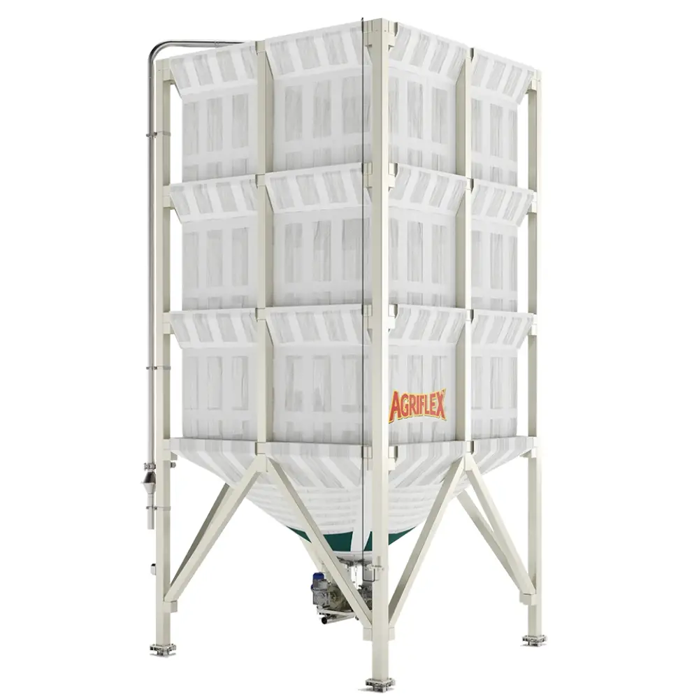 Silos designed for the storage of powdered products for the food industry (such as flour, sugar) and other raw materials (plastic). Agriflex Fabric Silos consist of a robust modular structure in galvanised or painted steel that supports the Trevira® technical fabric container. They are normally located inside the production facility, but they can also be located outside with the creation of a special technical room. Their shape and size are in fact perfectly adaptable to the available space. The capacity is variable up to 125 m3 and the Trevira® fabric is suitable for food use, with a very high mechanical resistance and remarkable antistatic properties, thus guaranteeing perfect safety of the stored product.