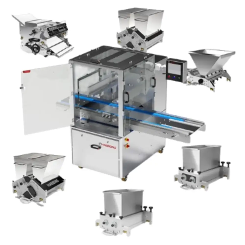 Equipped with two tanks for dough (e.g. two colors) or dough and filling. Hasborg Max-Universal includes forming slat with nozzle rotation for two-color extruded biscuits and one-color biscuits with filling, equipped with 6 nozzles.