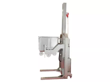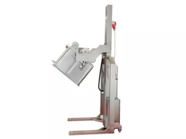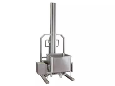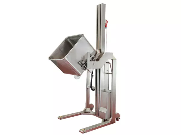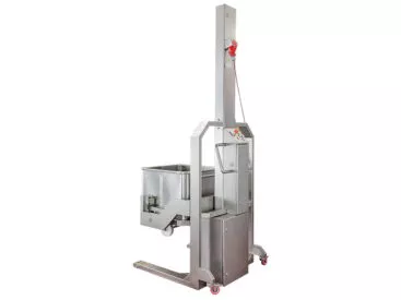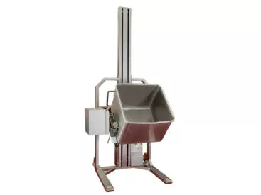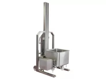 The HUB4BIN tipper solves the problem of both transporting and eliminating the heavy human labour of lifting and emptying eurobin containers. The ergonomic and safe transportation of the containers using a battery-powered manipulation trolley (cable-powered option) allows for trouble-free and convenient movement throughout the plant. The stable and lightweight construction means that even heavy stuffing containers can be easily transported and emptied, and the tipping height can be adjusted as required.