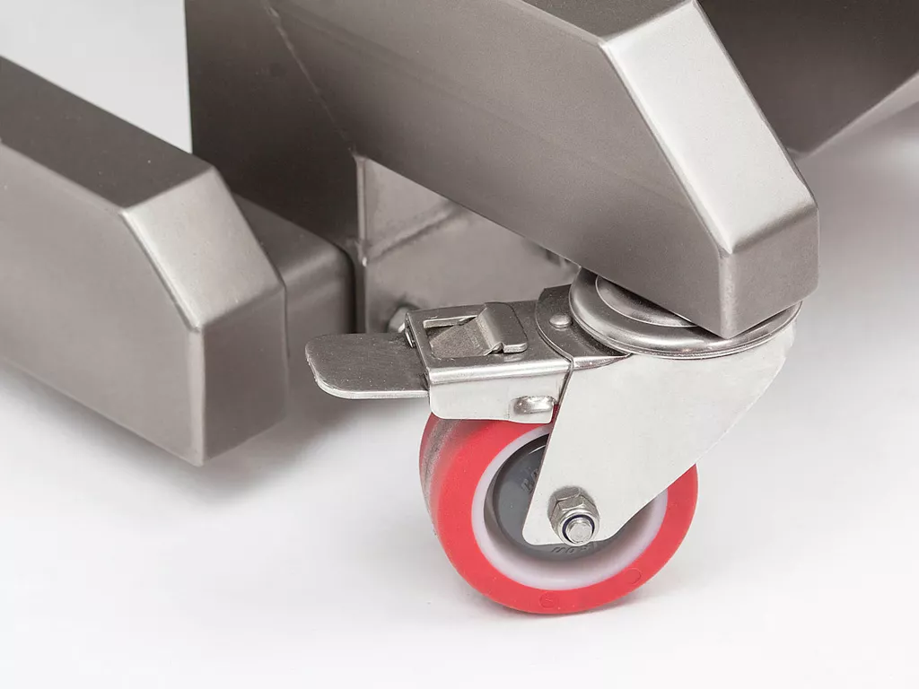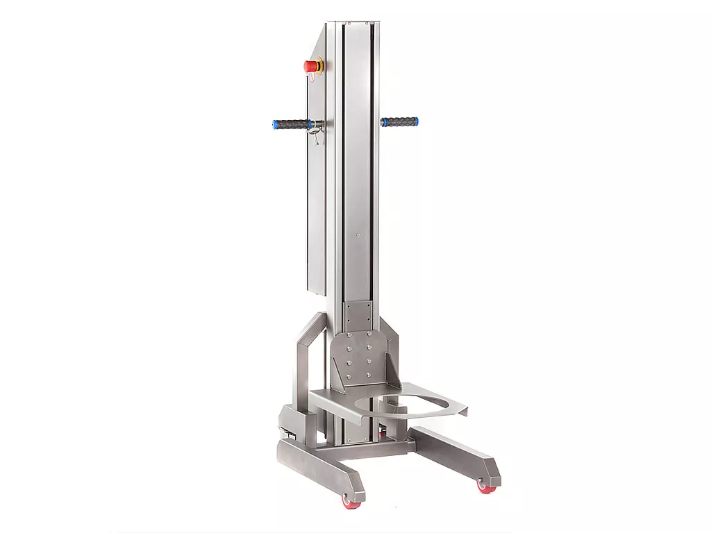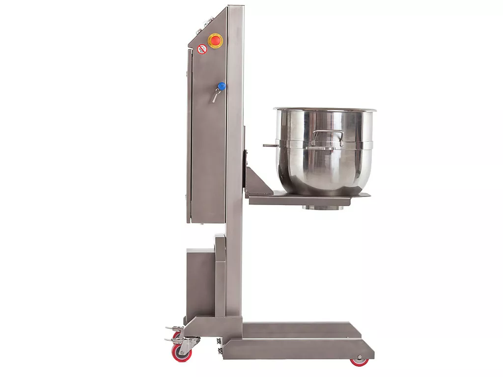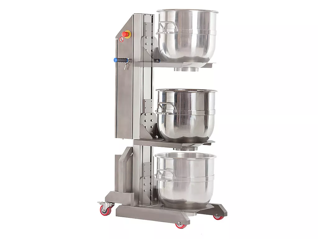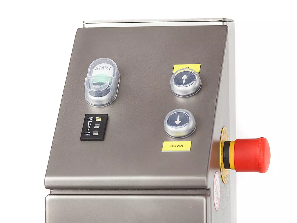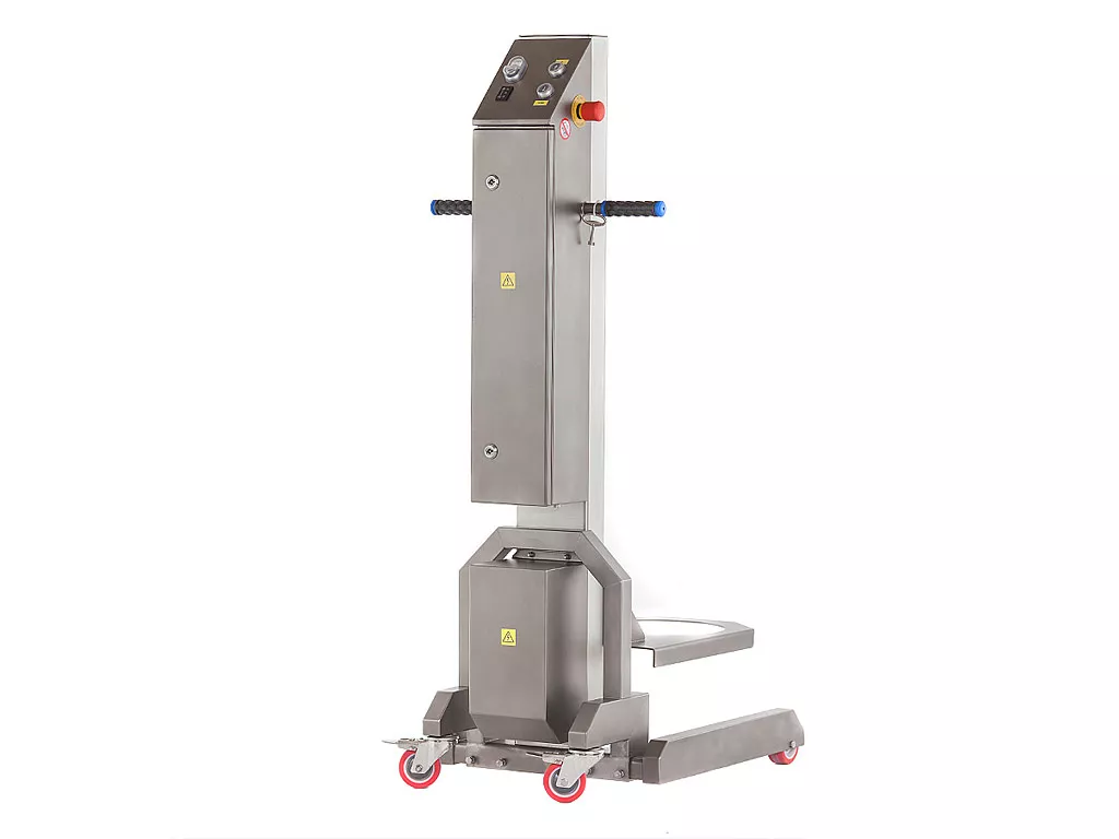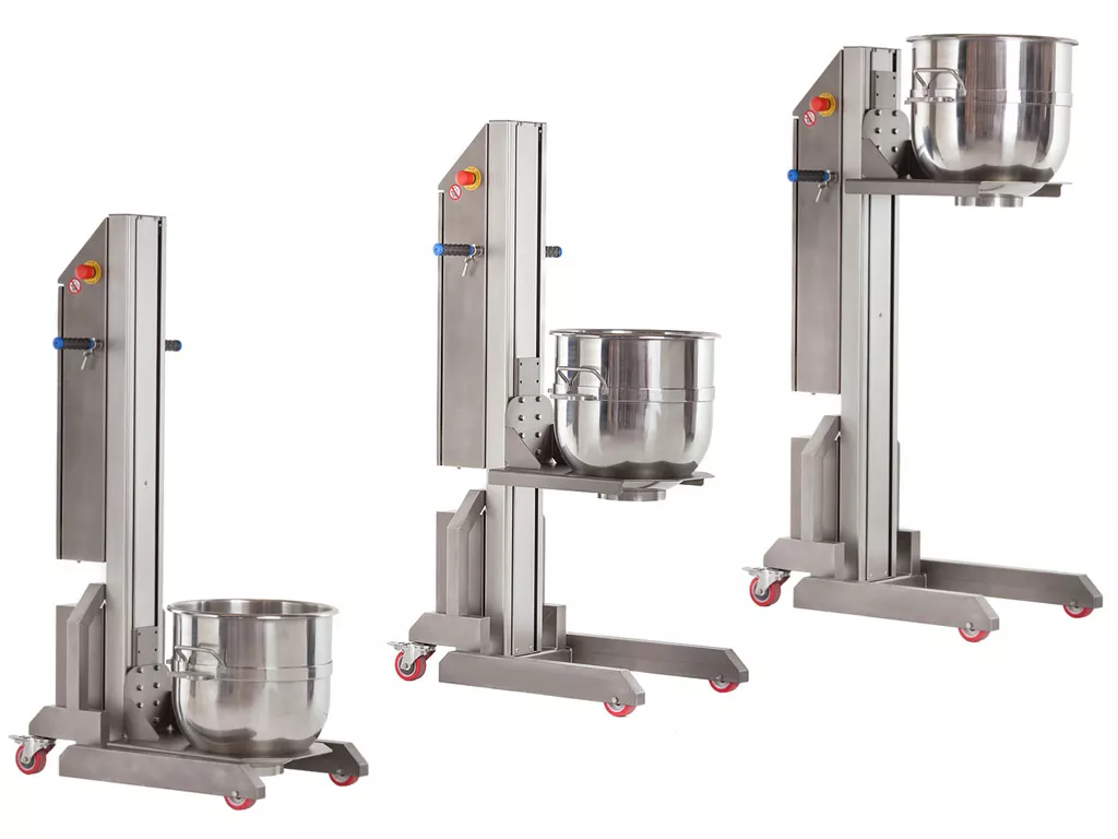 Collecting the bowl directly from the beater without moving it by hand. Lifting up to the ergonomic work height and automatic lowering. Effective operation in every place of your plant owing to the battery power supply. Super easy to move – a mobile castor lifter. Aesthetic stainless steel design – smooth device moulds easy to keep clean.